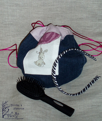 Так уж случилось, что у дочки порвалась косметичка, где хранились заколочки и резиночки для волос. Потому в срочном порядке пошился такой мешочек. Основой послужили мои джинсы для беременных, а украшением вышивка весёленького зайчика на воздушном шаре.